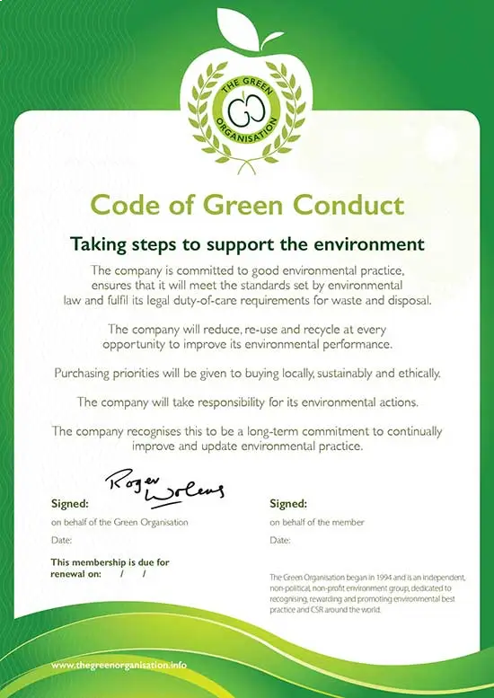 If you are happy to sign and display the certificate, you will help the environment, you will save money, and you will be entitled to become a certified member of The Green Organisation.